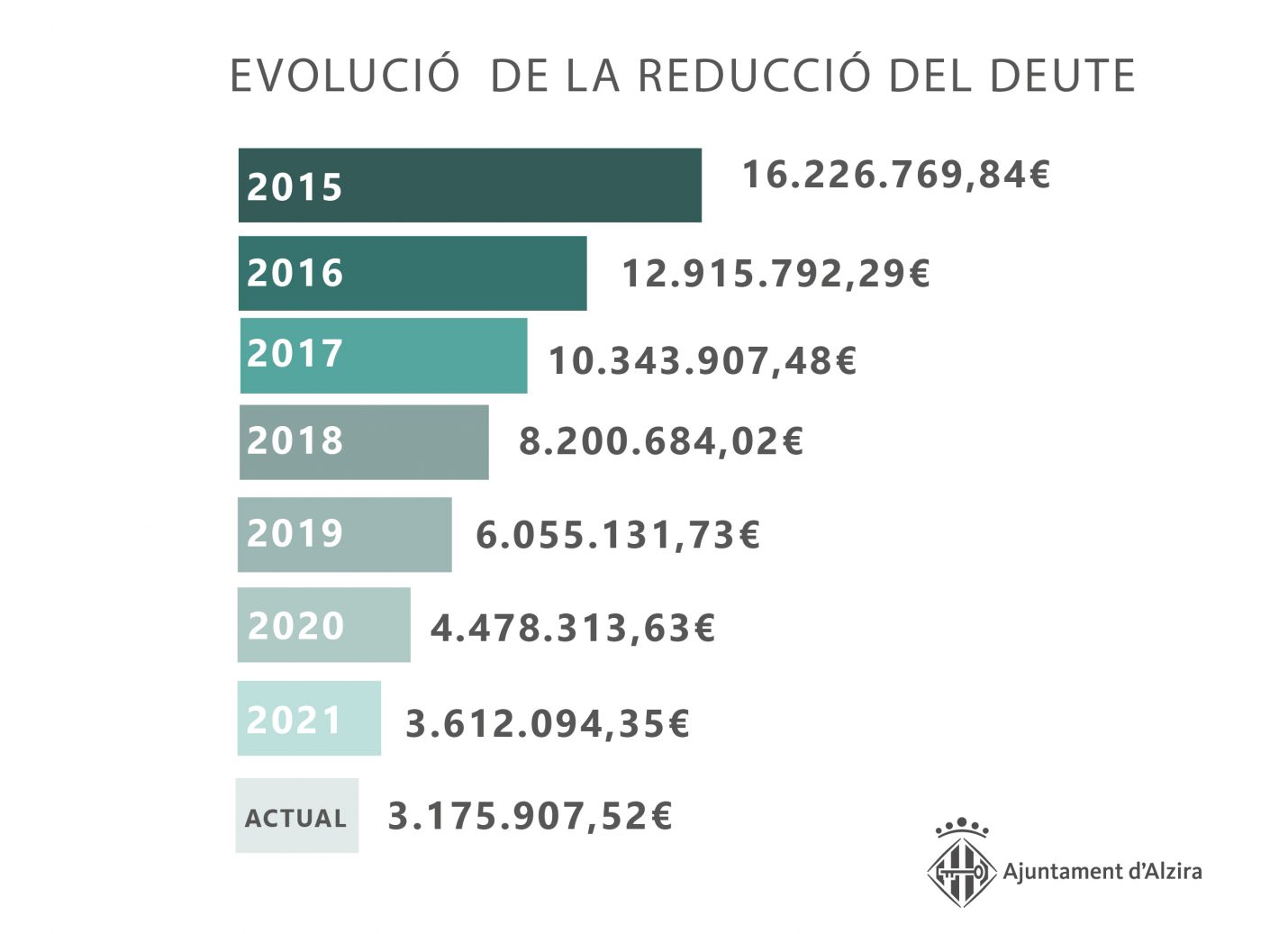 Alzira, 28 de juny de 2022._ L’Ajuntament d’Alzira continua la tendència de reducció del deute públic, que arriba per primera vegada als 3.175.907,52€ el que suposa uns 71€ per habitant.