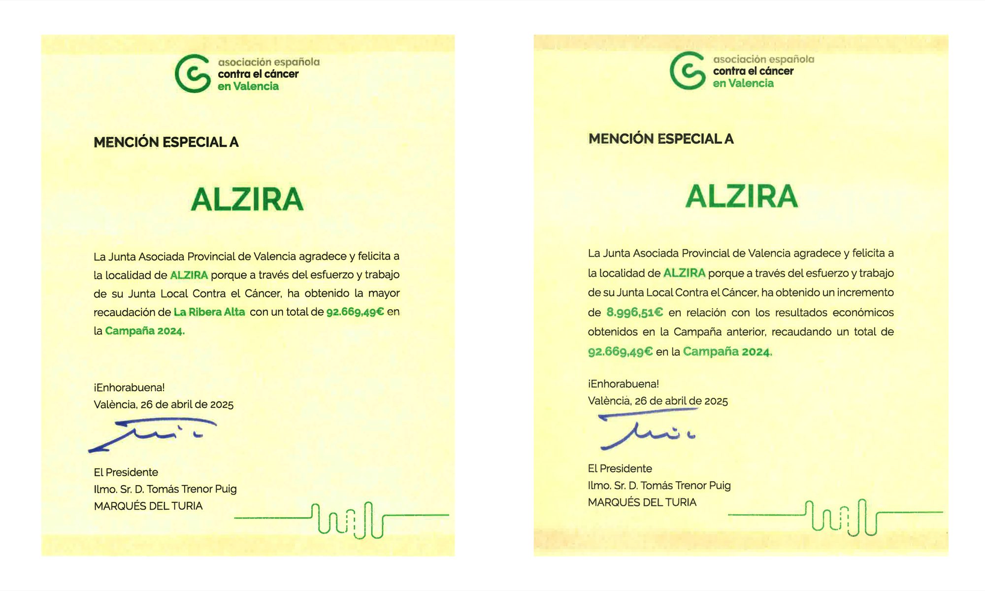 La Junta Local contra el Càncer d’Alzira ha sigut reconeguda amb dos mencions especials en la 63a Assemblea General Ordinària de la Junta Associada Provincial de València, celebrada el 26 d’abril passat. La primera menció fa referència al fet que s’ha recaptat un total de 92.669,49 € en la campanya 2024, fet que suposa la recaptació més grossa de la Ribera Alta. Esta primera menció ens porta a la segona, ...
