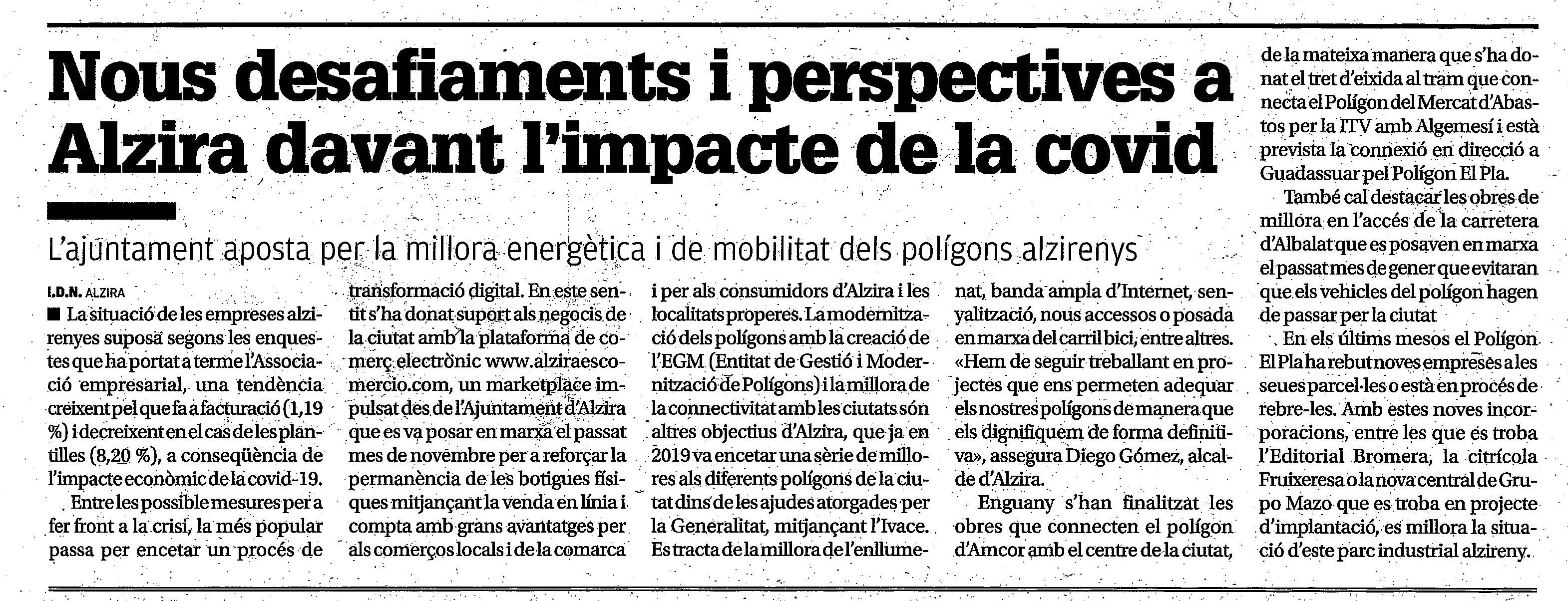 Nous Desafiaments i Perspectives davant la COVID 19: * L’Ajuntament d’Alzira aposta per la millora energètica i de mobilitat dels seus polígons industrials. * El Polígon de “El Pla” rep noves empreses en els últims mesos. La situació de les empreses alzirenyes suposa segons les enquestes que ha dut a terme l’Associació empresarial, una tendència creixent quant a facturació (1.19%) i decreixent en el cas de les plantilles (8.20%), a conseqüència de l’impacte econòmic que ha suposat la COVID 19. Ja en 2019 l’Ajuntament va iniciar una sèrie de millores en els diferents polígons de la ciutat dins de les ajudes atorgades per la Generalitat, mitjançant La IVACE. Es tracta de millora de l’enllumenat, banda ampla d’Internet, senyalització, nous accessos o posada en marxa del carril bici, entre altres. “Hem de continuar treballant en projectes que ens permeten adequar els nostres polígons de manera que els dignifiquem de manera definitiva”, assegura Diego Gómez, alcalde d’Alzira. En la mateixa línia, enguany s’han finalitzat les obres que connecten el polígon de AMCOR amb el centre de la ciutat, de la mateixa manera s’ha donat el tret d’eixida al tram que connecta el Polígon del Mercat d’Abastos per la ITV amb Algemesí i està prevista la connexió en direcció a Guadassuar pel Polígon de “El Pla”. També mereix destacar les obres de millora en l’accés de la carretera d’Albalat que es posaven en marxa el passat mes de gener i que milloraran l’accés a la ciutat. En Quant a l’ocupació de parcel·les en els polígons de la ciutat, cal destacar que en els últims mesos, el Polígon de “El Pla” ha rebut noves empreses en les seues parcel·les o està en procés de rebre-les. entre aquestes noves incorporacions, es troben entre altres: l’Editorial Bromera, la citrícola Fruixeresa o la nova central de Grup Mazo que es troba en projecte d’implantació.