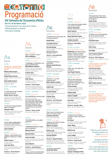 Alzira tornarà a ser l’epicentre econòmic, laboral i de noves tendències digitals entre el 14 i el 18 de febrer amb la celebració de la XIV Setmana de l’Economia d’Alzira. Les nombroses xarrades, ponències i taules rodones, dirigides tant a les noves generacions com al públic adult, promouran un clima d’aprenentatge compartit i enriquidor gràcies a la participació de conferenciants de gran nivell, expliquen des del Departament d’Idea, que s’encarrega de l’organització dels actes. Entre els noms més coneguts hi ha el periodista valencià Javier Ruiz, cap d’Economia de la Cadena SER, la comunicadora Samanta Villar, presentadora de 21 días i de Conexión Samanta, que oferirà el 14 de febrer a les 13 hores la xarrada inaugural «La clau de l’èxit: saber connectar», i el també mediàtic Pablo Simón, professor de ciències polítiques en la Universidad Carlos III de Madrid i analista habitual a El País, La Sexta, TVE o Cadena SER, que el 18 de febrer a les 10.30 h oferirà la conferència «Una generació entre dues crisis: de la Gran Recessió a la pandèmia».