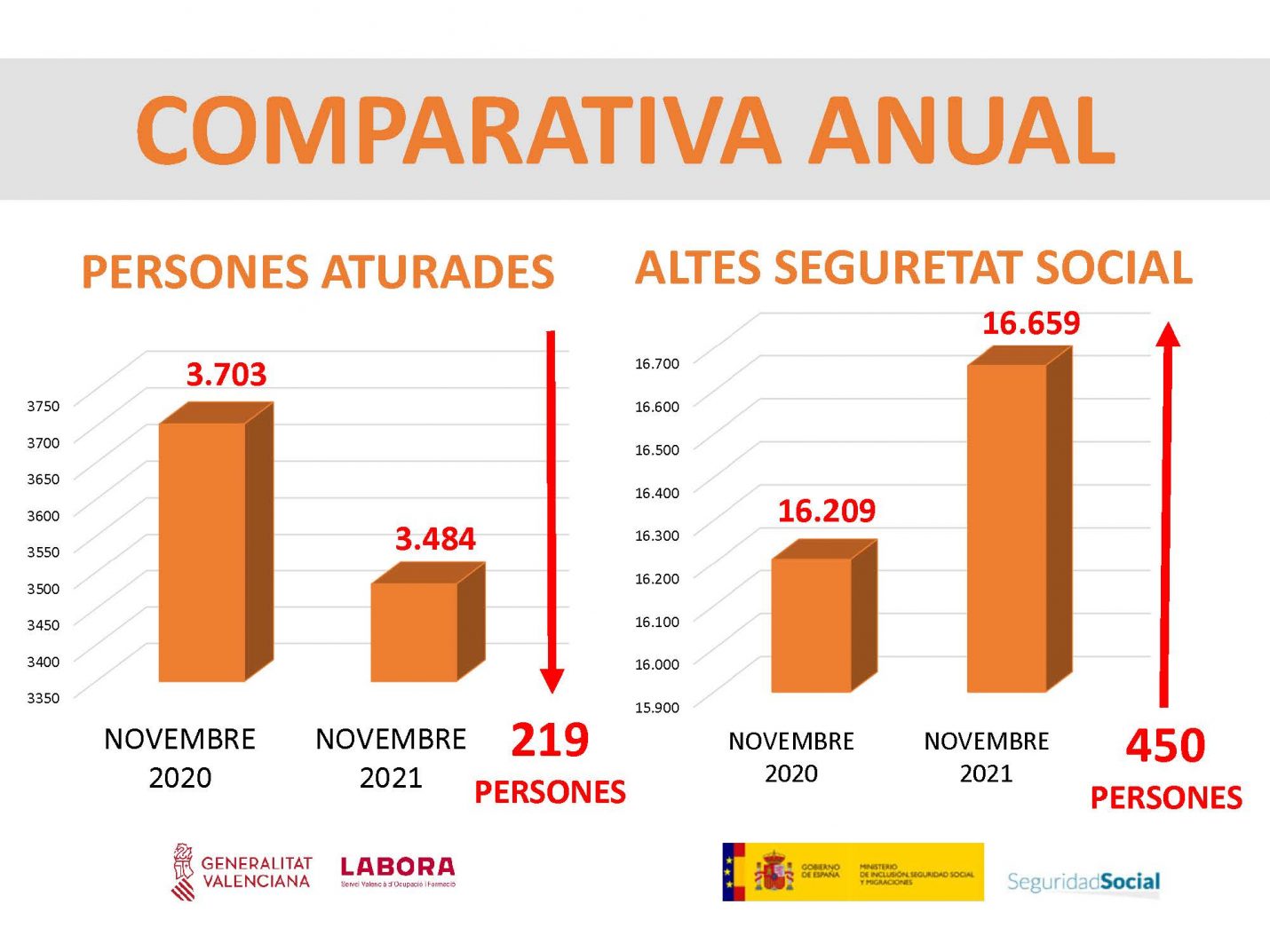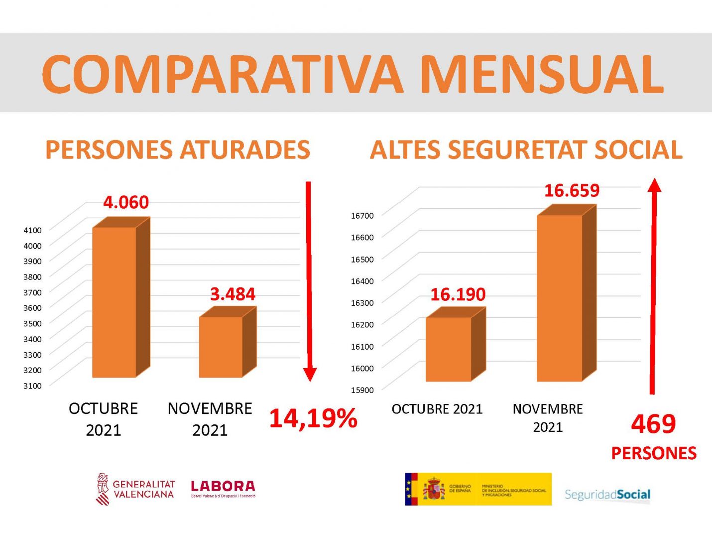 Alzira, 17 de diciembre de 2021. Hoy se han presentado en rueda de prensa los datos del paro relativos a la ciudad de Alzira. En relación a las cifras del mes de noviembre de 2021, ofrecidas por el Servicio Público de Ocupación y Formación de la Comunitat Valenciana (LABORA), los datos de las altas en la Seguridad Social son muy positivos después de este periodo de crisis y se igualan a las cifras de febrero de 2020.