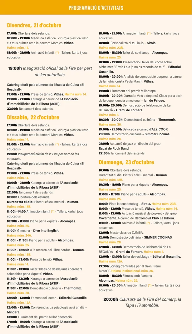 El público asistente podrá visitar las diferentes jaimas o casetas del comercio local donde también podrán participar en las actividades programadas por los expositores, animación infantil, música en directo, máster Class de zumba, batucada o radio en la calle.