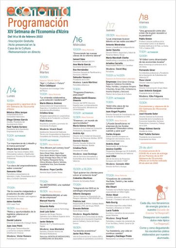 También recomienda la mesa redonda sobre los fondos europeos Next Generation, el jueves 17 de febrero a las 12.30 horas, «con la presencia del director general de Coordinación de la Acción de Gobierno en aspectos de fondos europeos, Juan Ángel Poyatos». Y, por último, el 18 de febrero, a las 12 h destaca la «charla importante sobre el fútbol como dinamizador de las economías locales, aprovechando también que celebramos el centenario de la UD Alzira, tendremos la presencia de Fernando Giner, exfutbolista y de Paco Lloret, director de Valencia Capital Radio» junto a ellos estaràn Juan Antonio Sanjuán, presidente de la UD Alzira, y Toni Mazo, director de comunicación de Grupo Mazo.