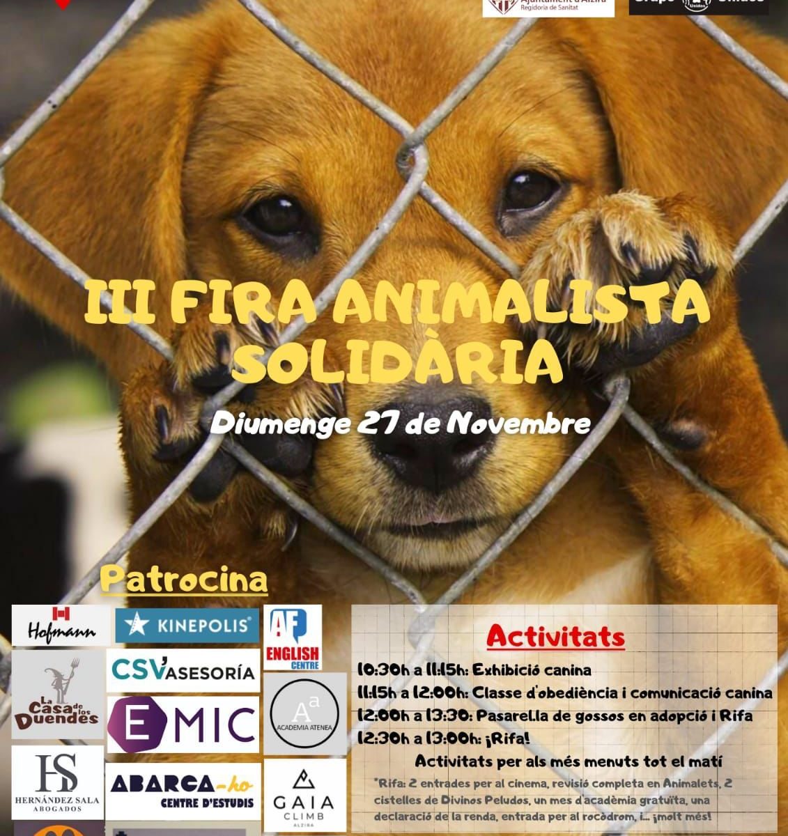 Alzira acoge la III Feria Animalista Solidaria. Será este domingo, 27 de noviembre a partir de las 10 horas en la plaza Mayor. Una iniciativa que organizan conjuntamente la concejalía de Sanidad del Ayuntamiento de Alzira, la Falla Hernan Cortés y el Grupo Unidos. El objetivo principal de esta feria es animar a la ciudadanía a adoptar. Entre las diversas actividades que se organizarán a lo largo de la mañana, ...