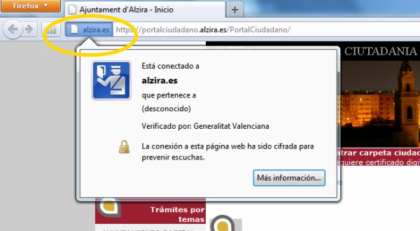 Porque en su navegador observará que la dirección de la Sede comienza por “https://”. Para establecer esta comunicación la Sede utiliza un sistema de firma electrónica mediante los llamados certificados de sede electrónica. Estos certificados permiten realizar el cifrado de la información y, además, identifican al Ayuntamiento de Alzira como propietario de la Sede.
