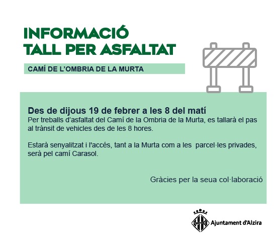 Este dijous, 19 de febrer de 2026, a partir de les 08:00 h, es produirà un tall temporal de trànsit al Camí de l’Ombria de la Murta, que romandrà tancat a la circulació amb motiu de treballs d’asfaltatge i millora del ferm.