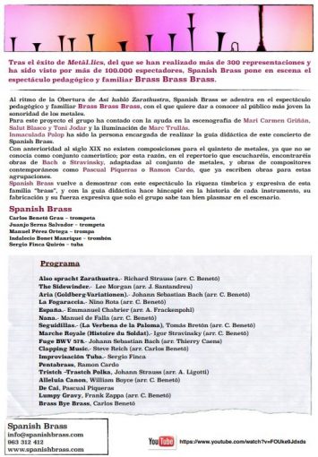 Spanish Brass ‑un quinteto de metal formado por Carlos Benetó, trompeta, Juanjo Serna, trompeta, Manolo Pérez, trompa, Indalecio Bonet, trombón, y Sergio Finca, tuba- «vuelve a demostrar con este espectáculo la riqueza tímbrica y expresiva de la familia brass», detallan. Según indican, «con anterioridad al siglo XIX, no existen composiciones para quinteto de metales; por esta razón, el repertorio incluye adaptaciones de obras de Bach, Boyce o Stravinski, y obras de compositores contemporáneos como Pascual Piqueras o Ramon Cardo, que ya escriben obras para estas agrupaciones». El espectáculo consta de unas veinte piezas. La interpretación de los temas se combina con la explicación de los instrumentos, con curiosidades y comentarios más técnicos que ofrecen la posibilidad de ampliar los conocimientos musicales del alumnado: «Salen encantados, siempre hemos tenido muy buena acogida», aseguran desde Spanish Brass.
