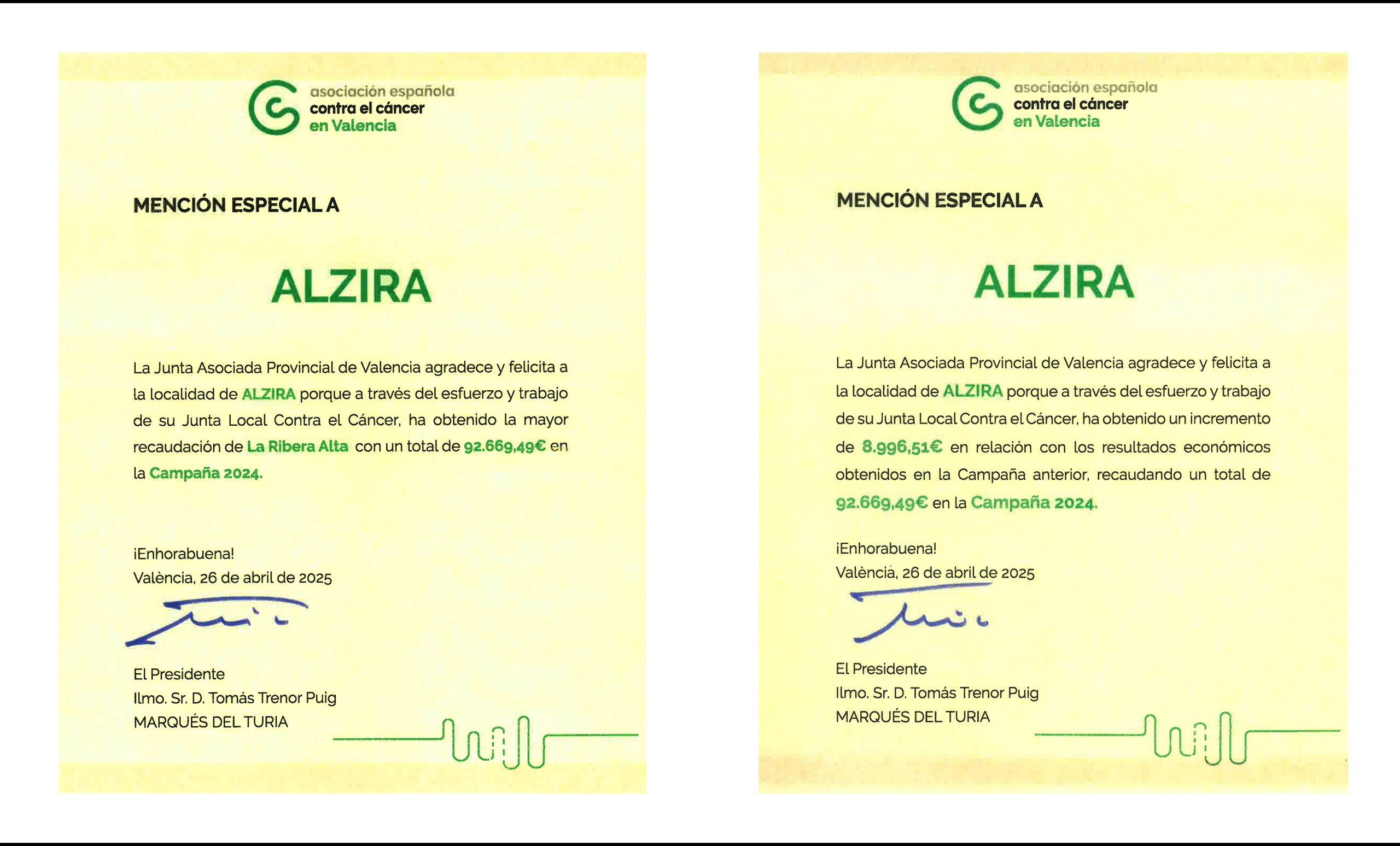 La Junta Associada Provincial de l’AECC atorga a la Junta Local d’Alzira dos mencions especials